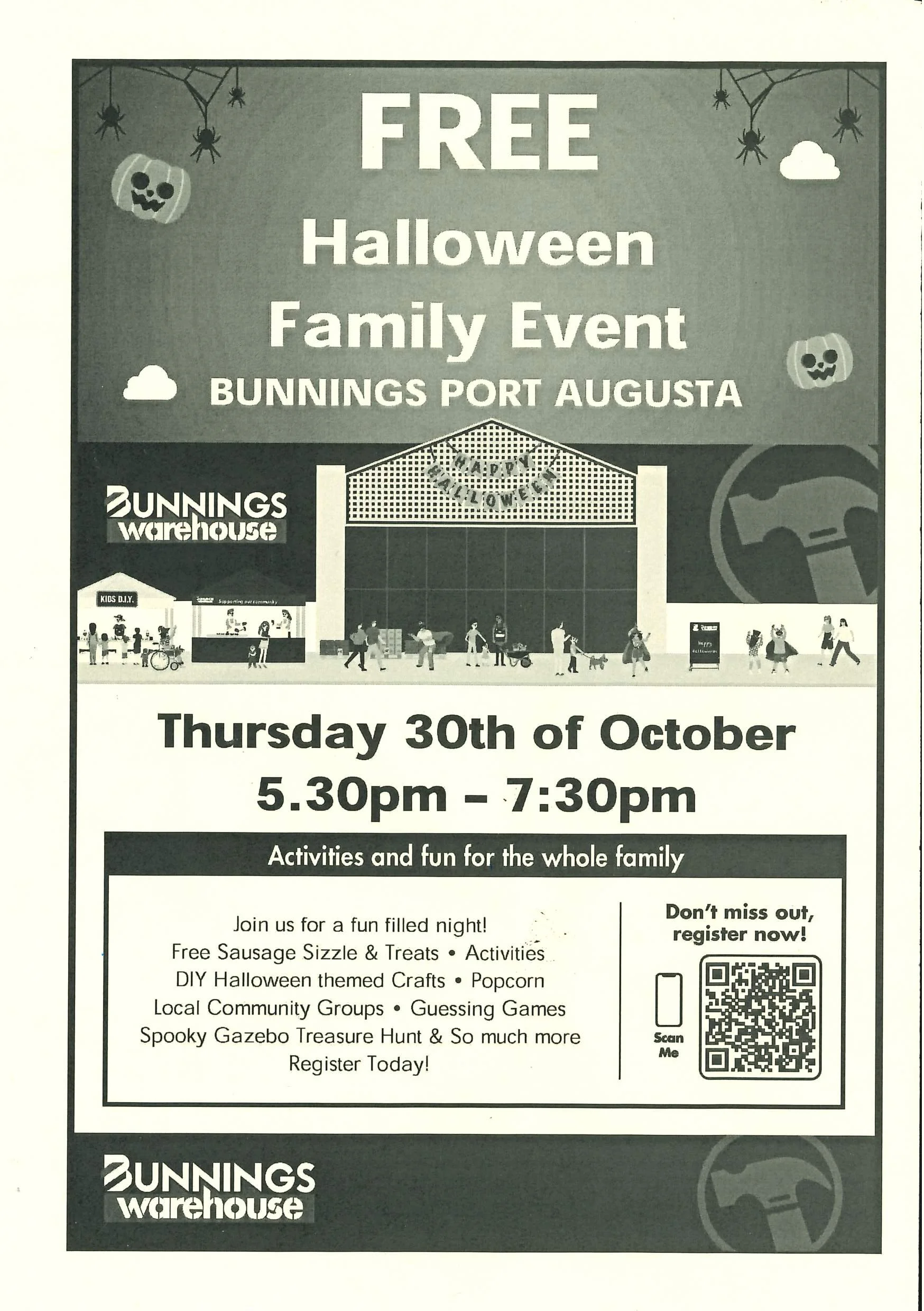 Free, At Bunnings Port Augusta. Register by the QR for Treats, Activities, Crafts, Games and Treasure Hunt